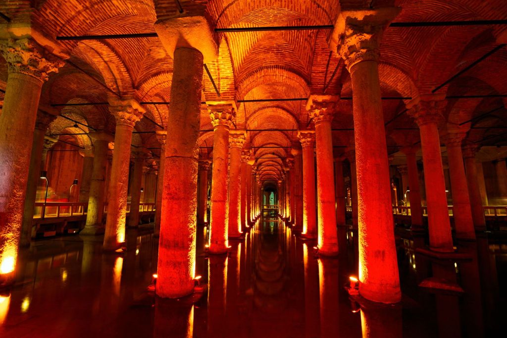 비잔틴 시대에 궁전의 물 수요를 충족시키기 위해 지어진 저수조는 여전히 눈길을 끄는 기둥과 메두사 조각상으로 보는 사람들을 놀라게 한다.